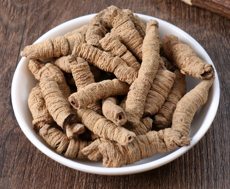 巴戟天來源於茜草科植物巴戟天的幹燥根,味甘、辛,性微溫,歸腎經和肝經。功效與作用是補腎陽、強筋骨、祛風濕,用於緩解陽痿遺精、宮冷不孕、月經不調、少腹冷痛、風濕痹痛、筋骨痿軟等癥狀。臨床使用時常用鹽制巴戟天入藥,以增強引藥入腎的作用,此外還有用甘草水來制巴戟天,增強其甘溫補益的作用,偏重於補腎陽、強筋骨。
