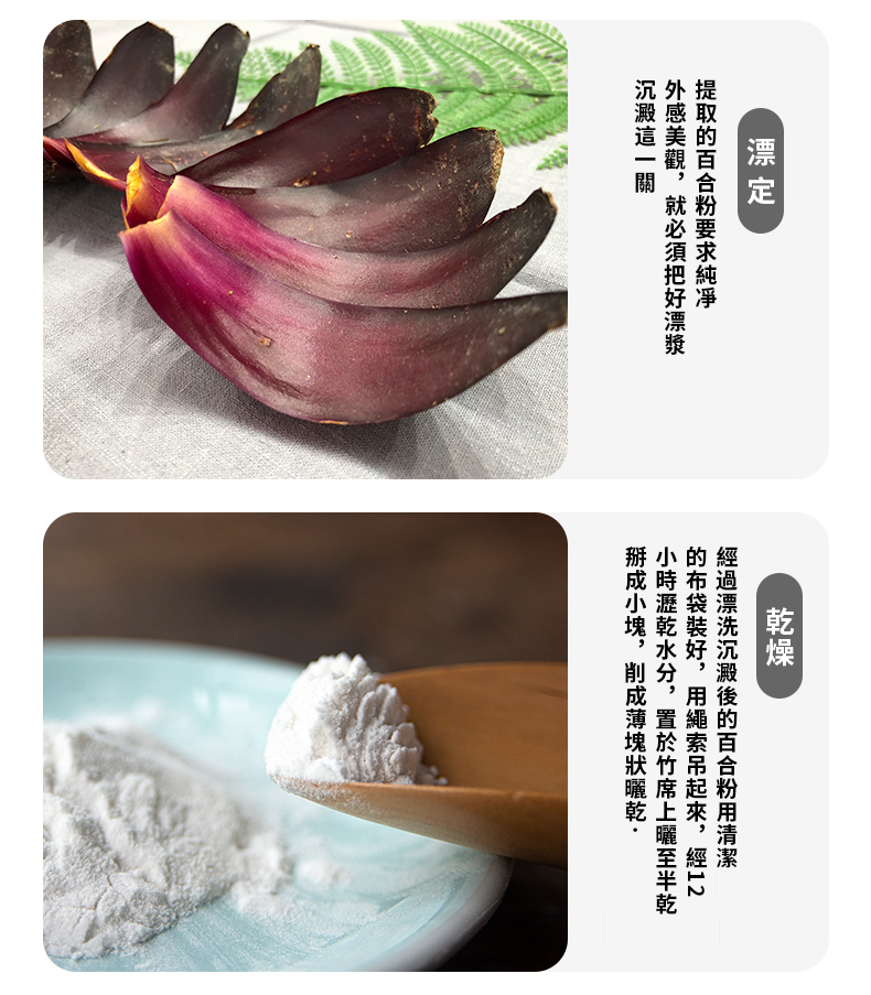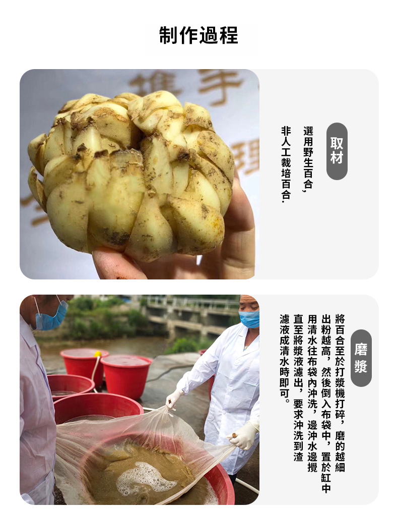 我們的百合粉原材料采用的是野生龍牙百合、頁巖百合和大葉百合按照均衡比例,遵循古法工藝制作而成的,產量有限,而且珍貴在食療方面比普通乾百合磨粉來的好。